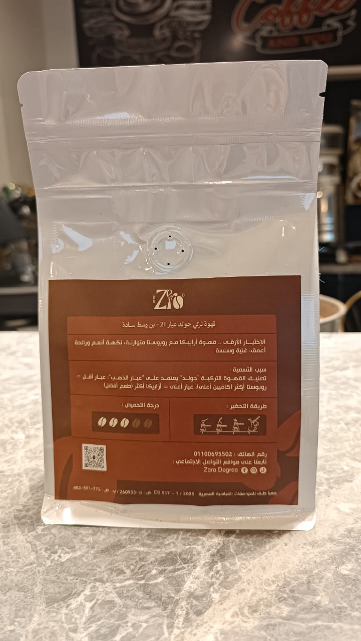 توليفة تركي جولد عيار 21 معمولة للي بيدوّروا على فنجان مظبوط من غير مبالغة. لا كافيين عالي قوي زي عيار 18، ولا تركيز أرابيكا عالي زي عيار 24، لكن توازن مدروس يديك طعم ثابت، قوام مظبوط، ومزاج رايق في كل فنجان.